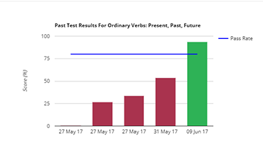 Each time you take the test for a certain lesson, your score is recorded in a chart so you can track your progress in each topic through time. Our goal is to help you achieve 100% on every test by giving you detailed feedback on your test results.